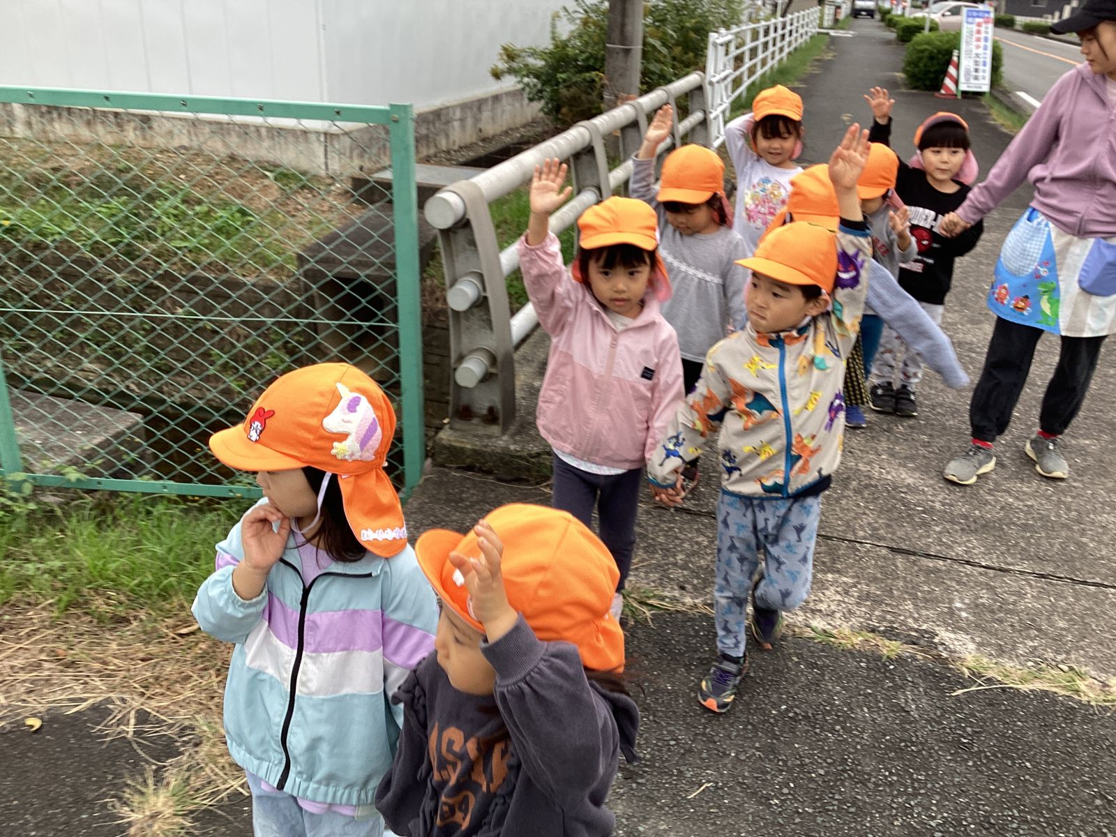 天気の良い日に散歩に行きました。交通安全教室で教わったことをしっかりと覚えていたみかん組さん。横断歩道もピンと手を伸ばして渡っていましたよ。景色を見ながら散歩を楽しんでいました。