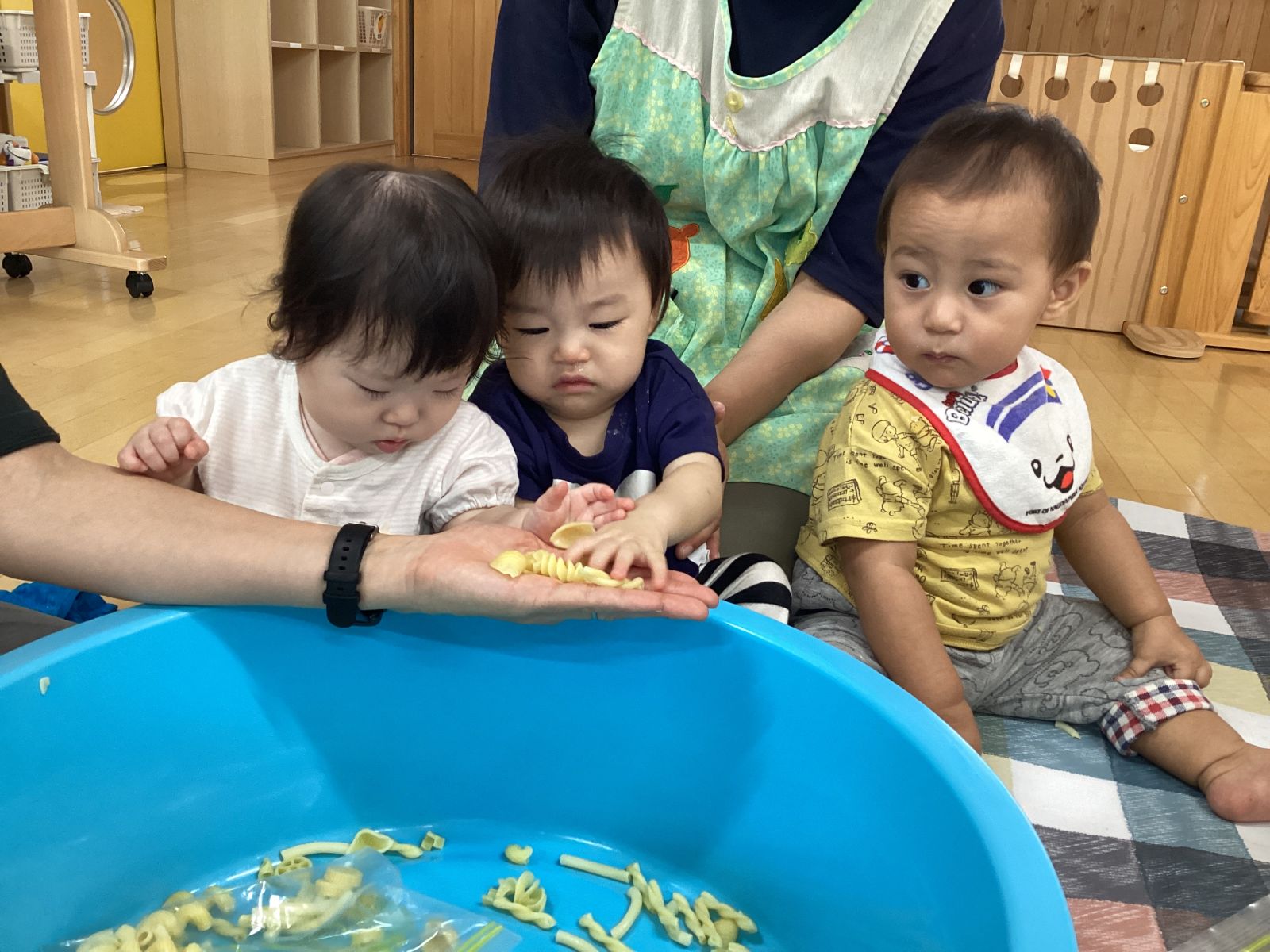 マカロニを茹でたものを用意すると、はじめは不思議そうに見つめていた子ども達。