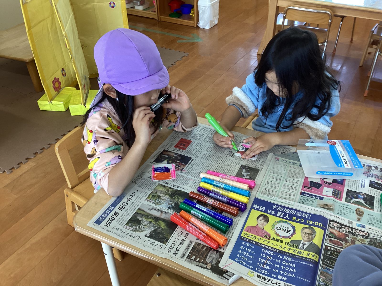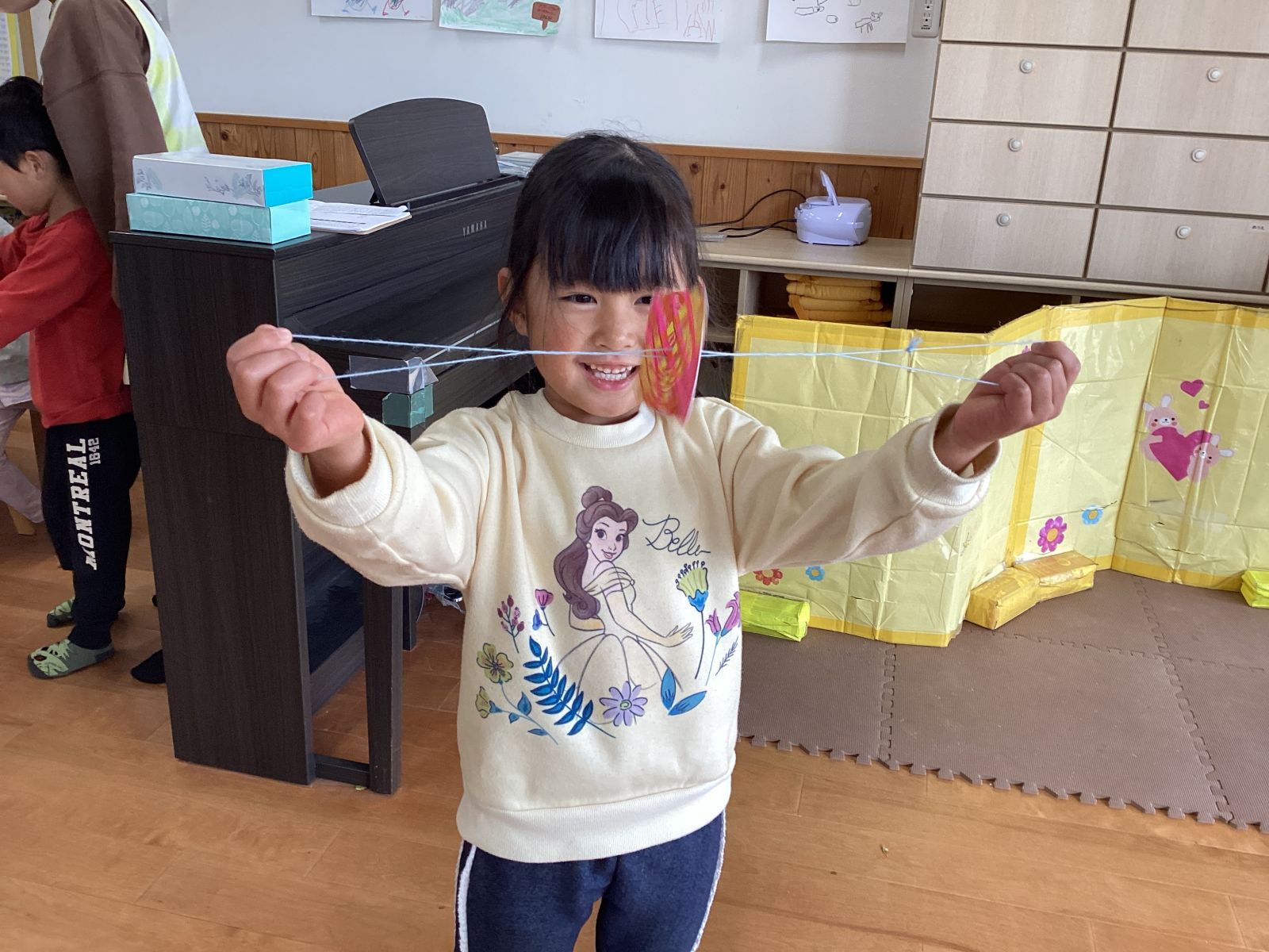 絵や模様を厚紙に描いてびゅんびゅんゴマを作りました。初めは上手く回らず悔しそうでしたが何度も挑戦して「みてみて!」「上手に回せたよ!」と嬉しそうに見せてくれるぶどう組さんでした。