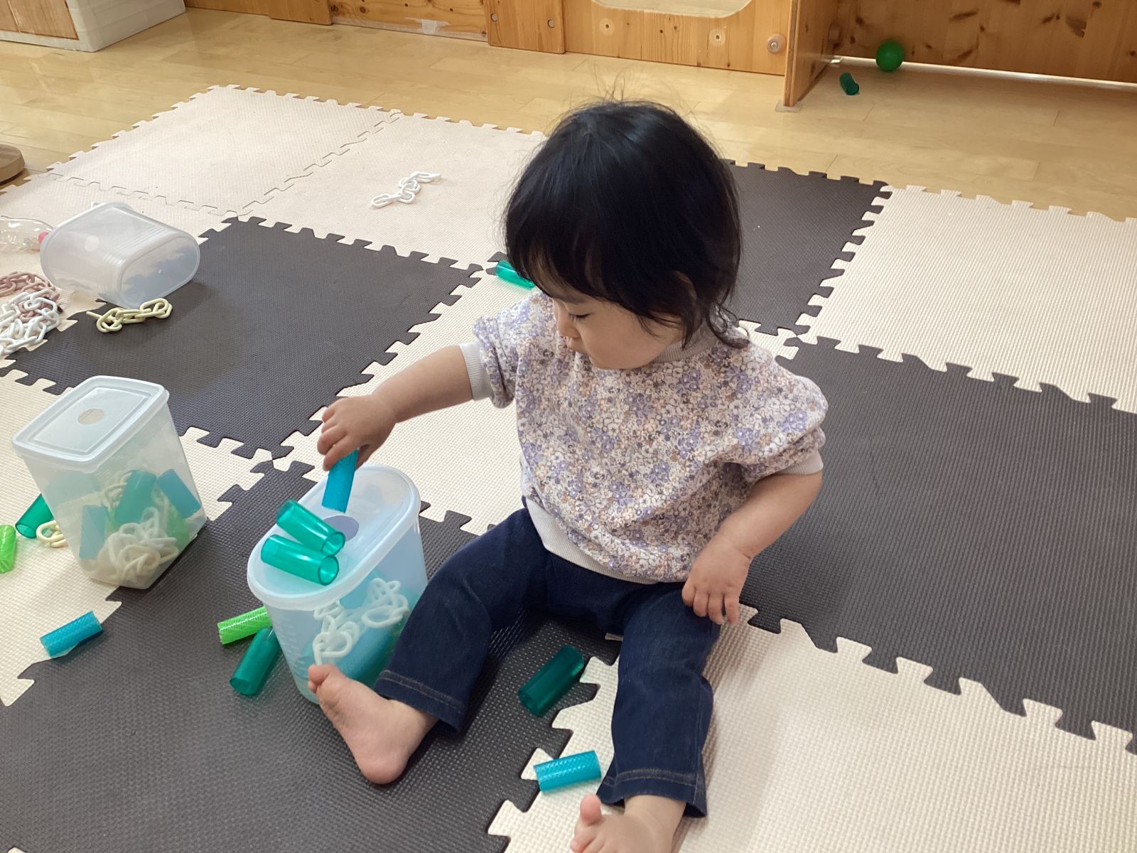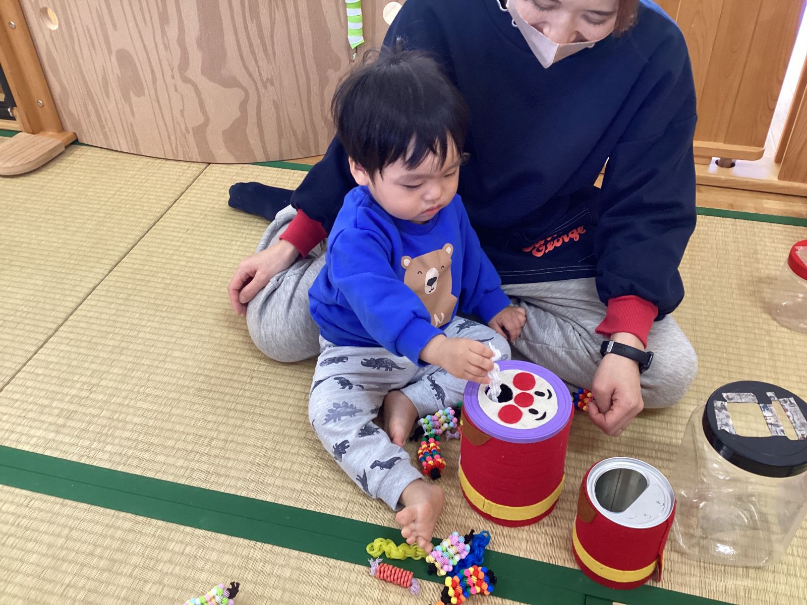 入れ落としが好きな子ども達、入れ物にポトン!と入ると嬉しそうな表情を見せてくれました。