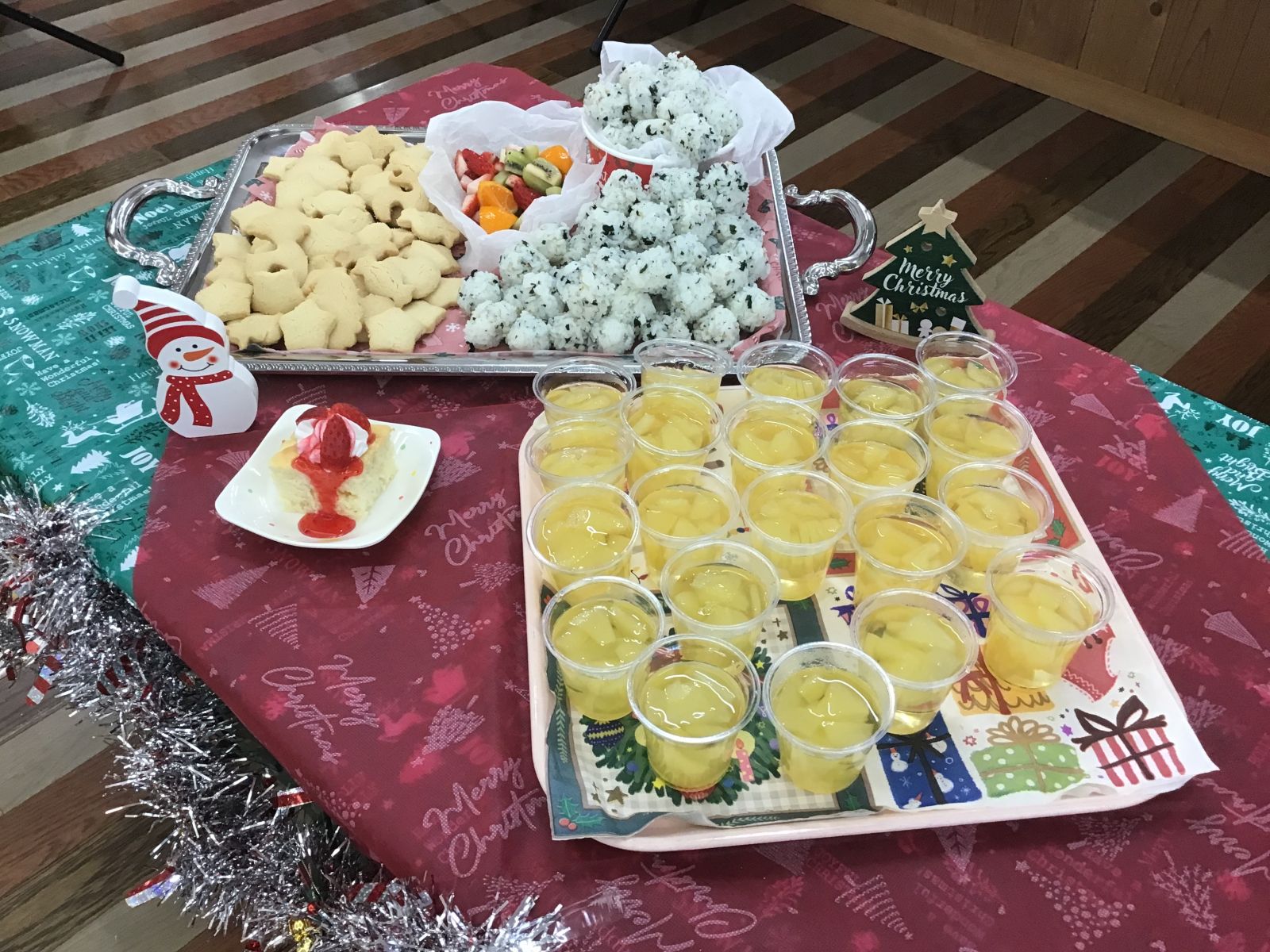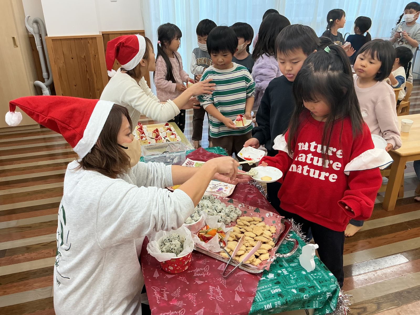 一足早くクリスマスメニューを楽しみました。子どもたちお楽しみのおやつバイキングです。「クッキーがあるよ」「おにぎりたべたいな」などお友達とお話をしながら好きなおやつを選ぶこどもたち。たくさんの笑顔がみられましたよ。