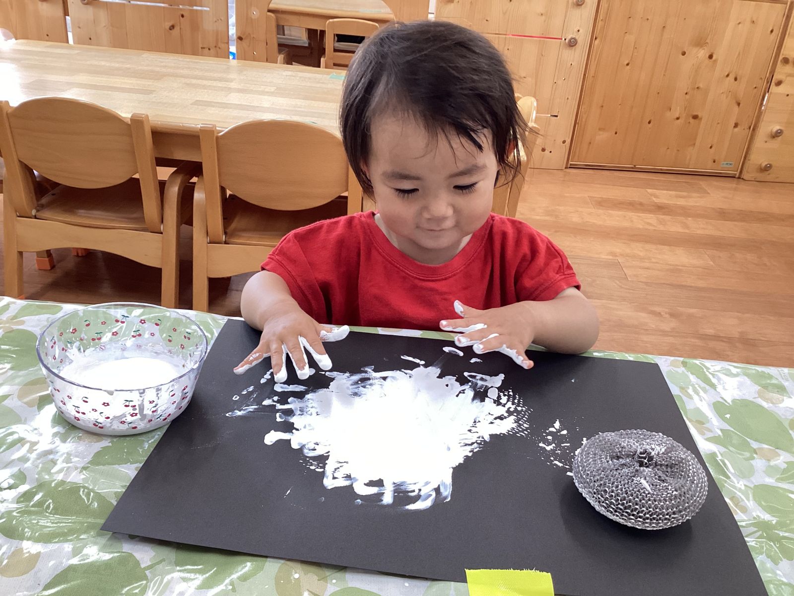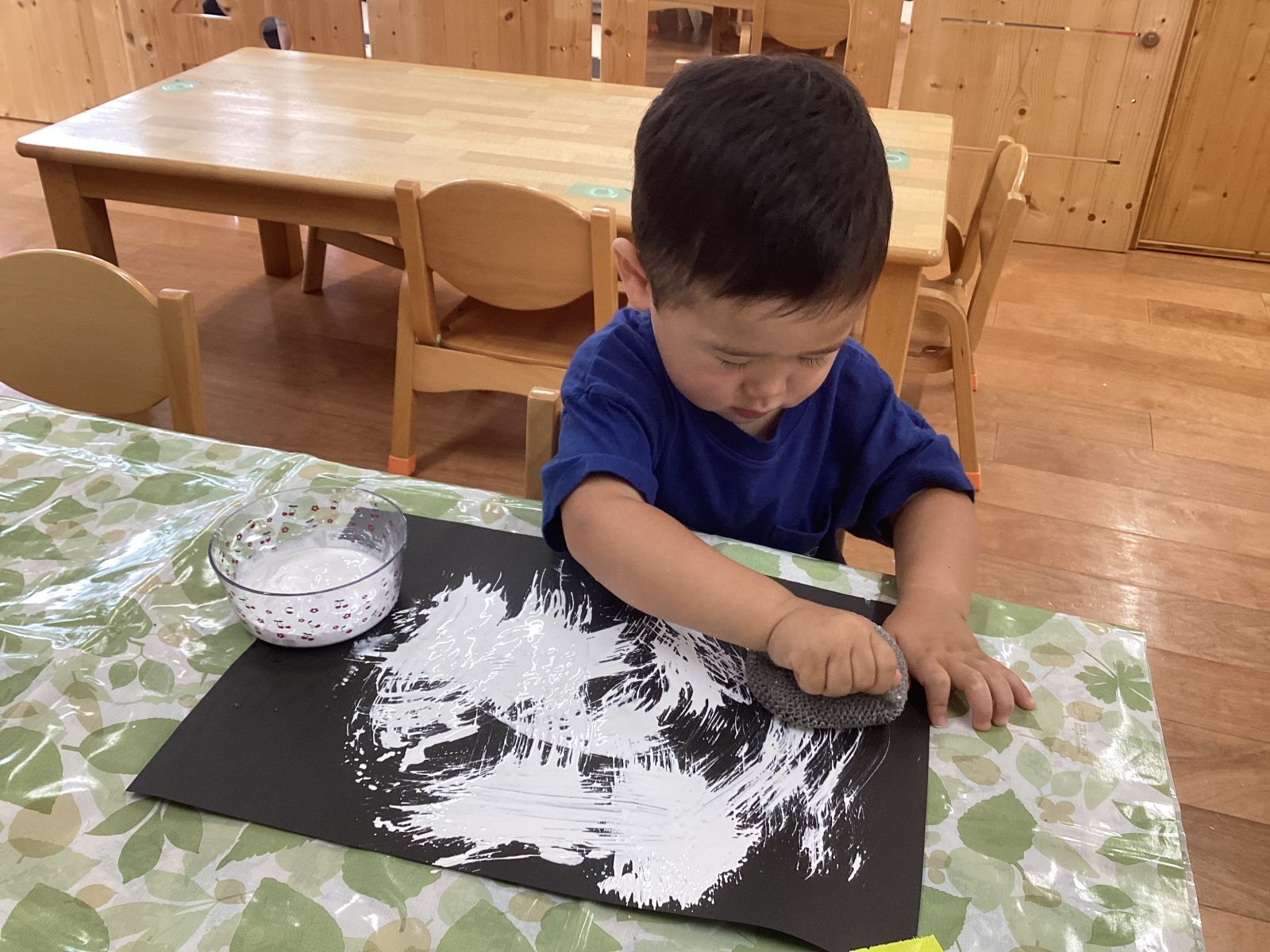 絵の具の感触を味わいながらニコニコで楽しむ事ができました。